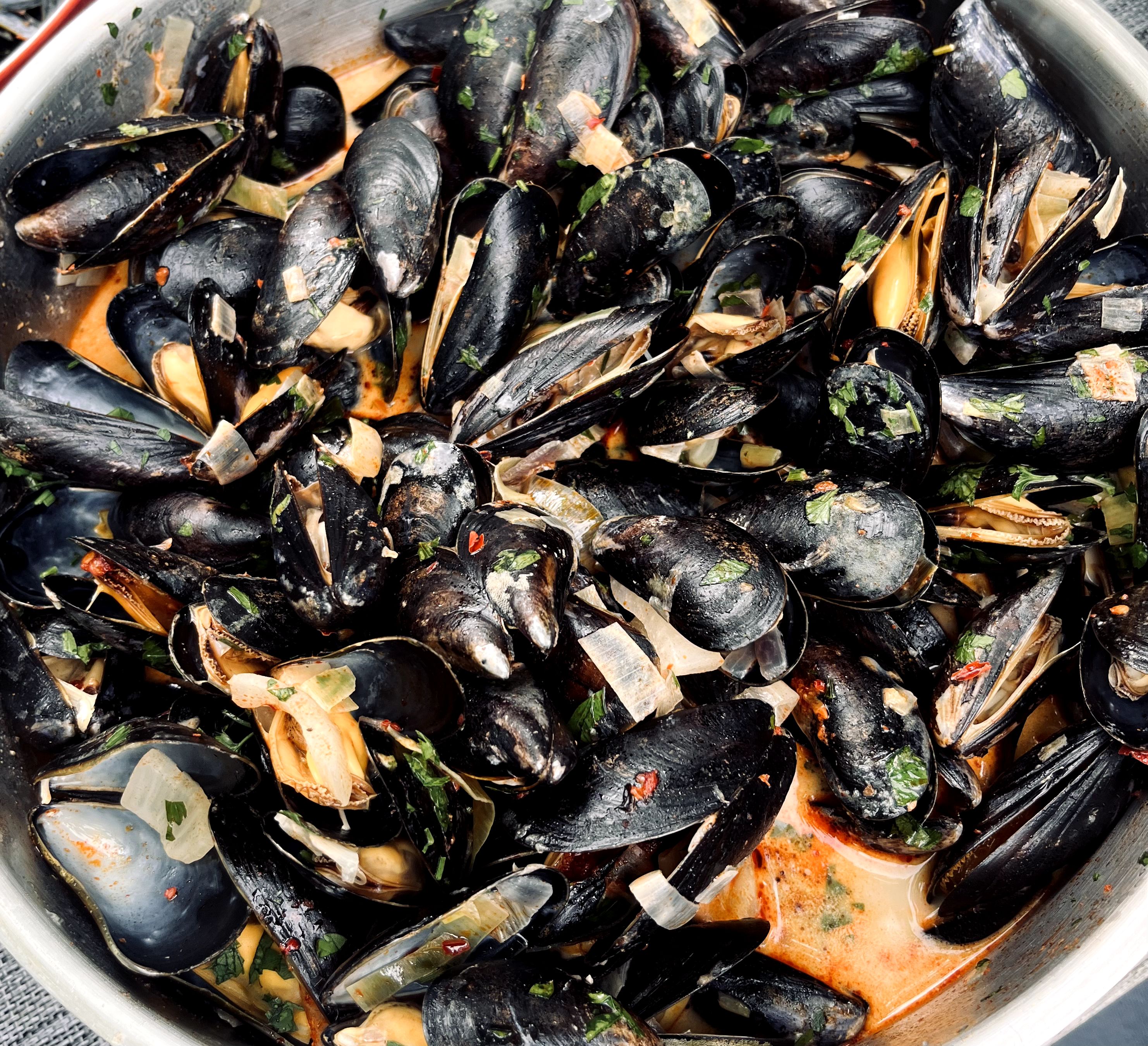 Voeg de saus met de kokosmelk nu weer toe aan de mosselen en roer door. Bestrooi de mosselen met verse peterselie en breng op smaak met zout en peper.