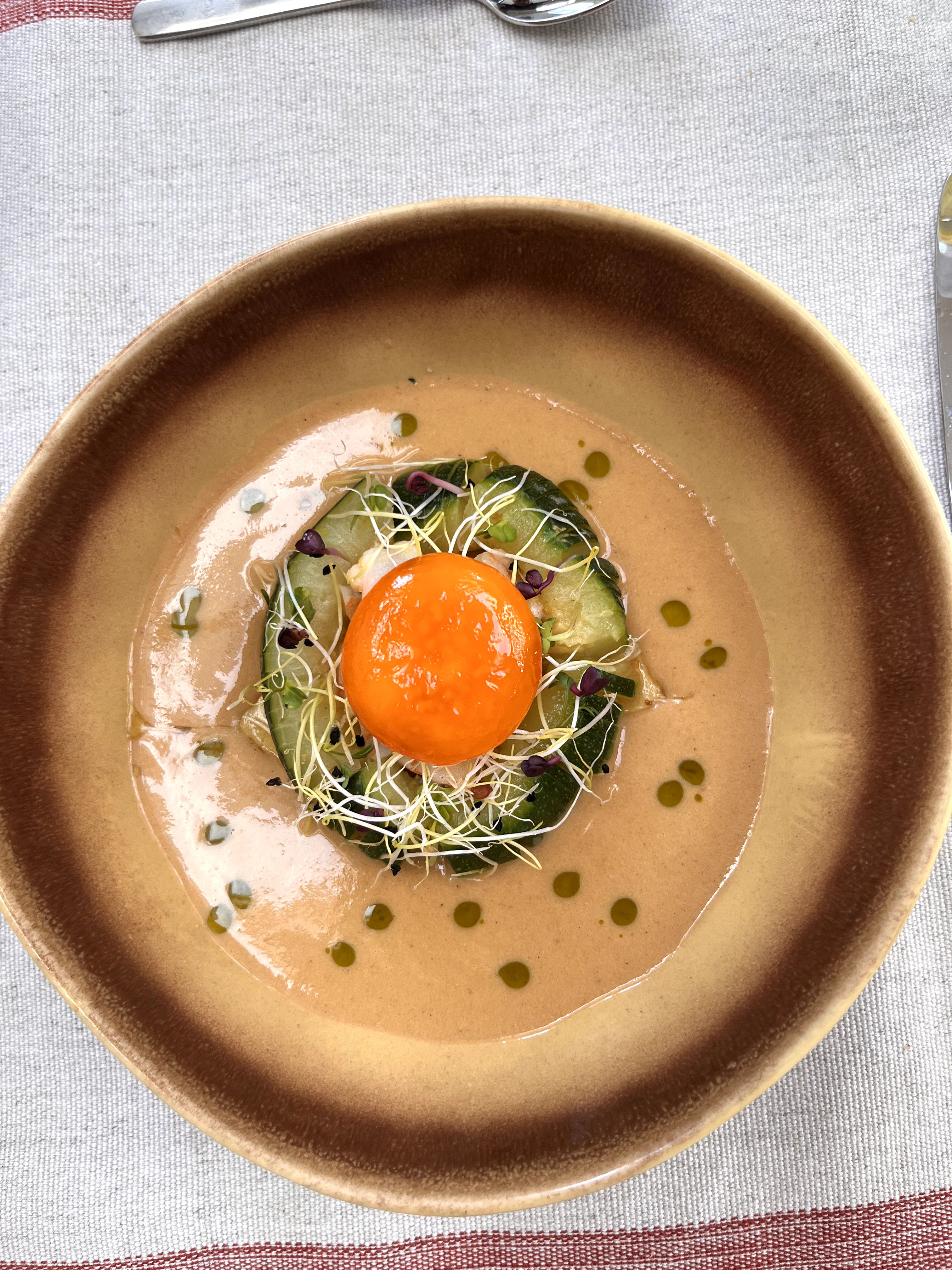 Bisque van steurgarnaal met ingelegd eigeel en courgette