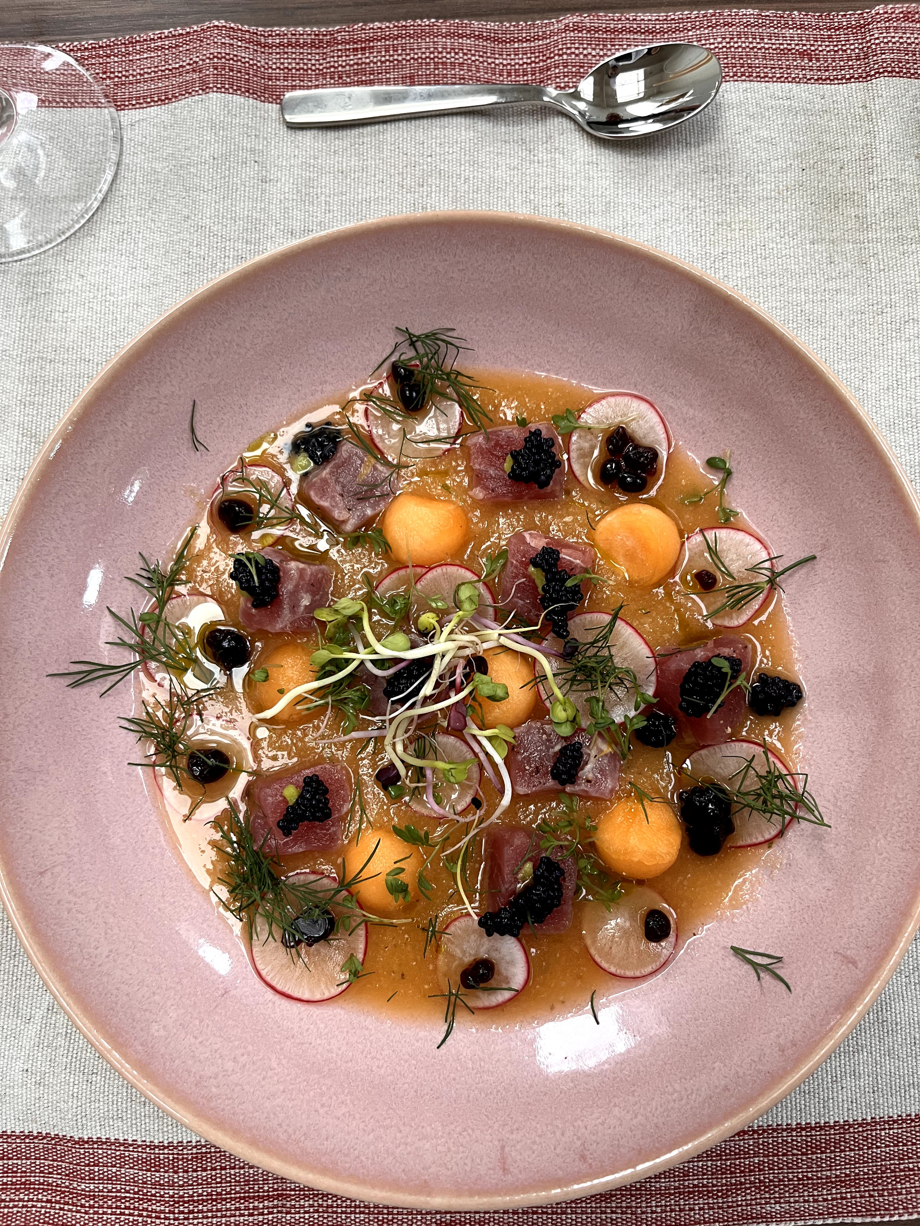 Een verfrissende cantaloupe gazpacho geserveerd met sappig gemarineerde tonijnsteak, verrijkt met cantaloupe balletjes, balsamico parels, radijsschijfjes, kaviaar, tuinkers en dille. Perfect voor een zomerse dag of als chique voorgerecht bij een diner.